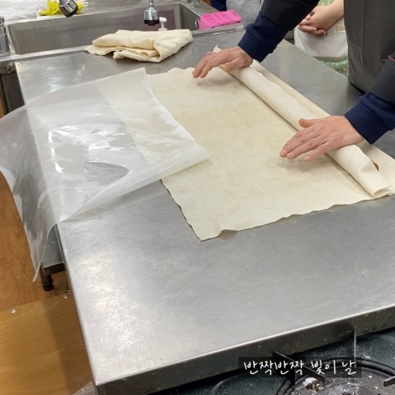 8. 주름이 생기지 않도록 긴 막대기로 무명천을 말아 당겨 시트를 김밥처럼 가볍게 누르면서 감는다.★ 긴 막대기를 사용하여 일정 강도의 힘으로 되감아 말기 마지막 부분에 잠시 머물며 말린 부분이 풀리지 않도록 한다. 무명천을 감은 후 바로 떼어내지 않으면 면천에 반죽이 들러붙어 무늬가 떨어지므로 주의할 것.