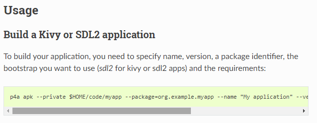 p4a apk –private $HOME/code/myapp –package=org.example.myapplication–name “My application” -version 0.1 –bootstrap=sdl2 –requirements=