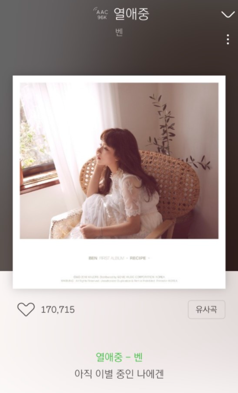 안녕하세요. 오늘은 여성 솔로 가수 벤을 소개합니다.벤의 그 절절한 목소리가 너무 마음에 들어요이별후에 들으면 눈물이 날수도 있으니 주의해주세요!!!~