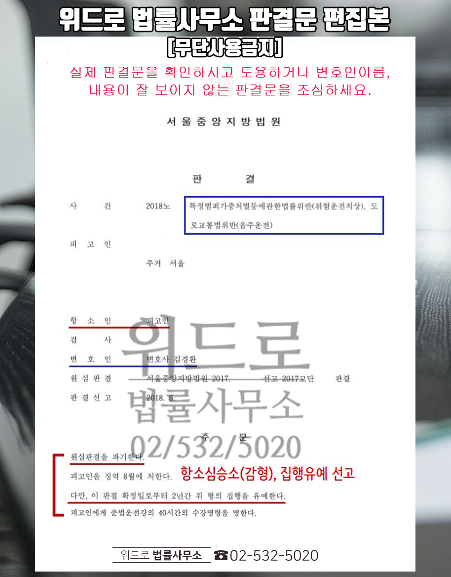 그 결과 음주운전 징역형에 대한 부분은 1/2로 감형되었고, 음주운전 사회봉사시간도 대폭 감형되었습니다. 이처럼 항소심의 승소는 해당 사건을 맡아 성공사례로 많이 이끈 법률가의 실력과 노하우로 철저히 준비한 덕분이라고 할 수 있습니다.