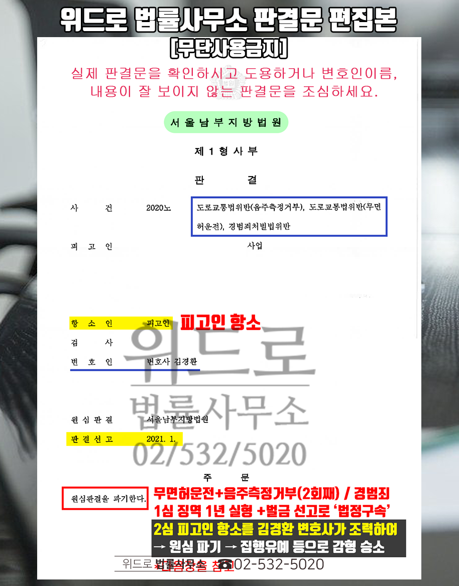 무면허 상태에서 술을 마시고 운전하며 측정까지 거부한 사건.실형과 법정 구속 판결을 받은 이후 2심 진행 결과 집행유예에서 감형 승소했습니다.