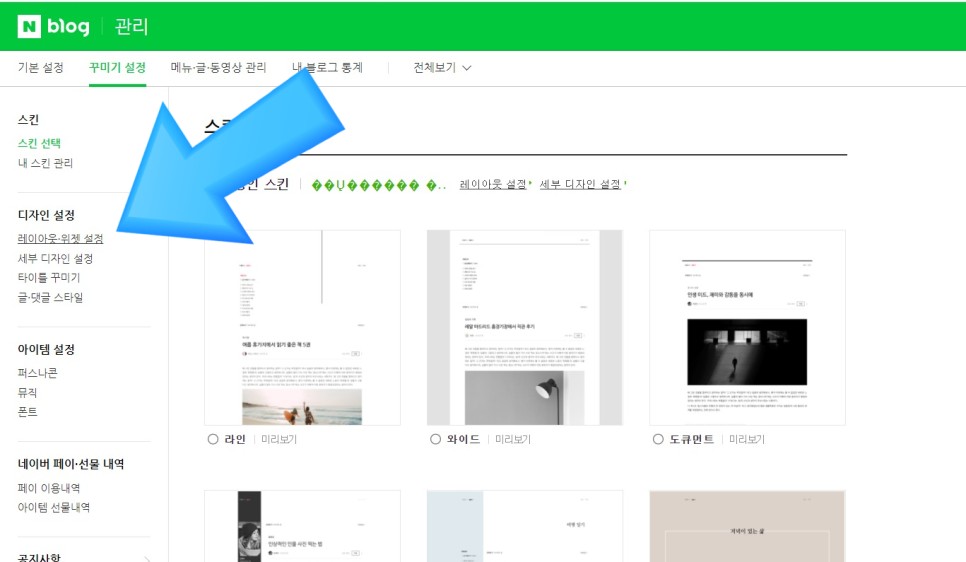 그러면 블로그 관리로 이동해서 설치를 해보도록 하겠습니다관리로 데코레이션 설정 레이아웃, 위젯 설정으로 들어가야 합니다.