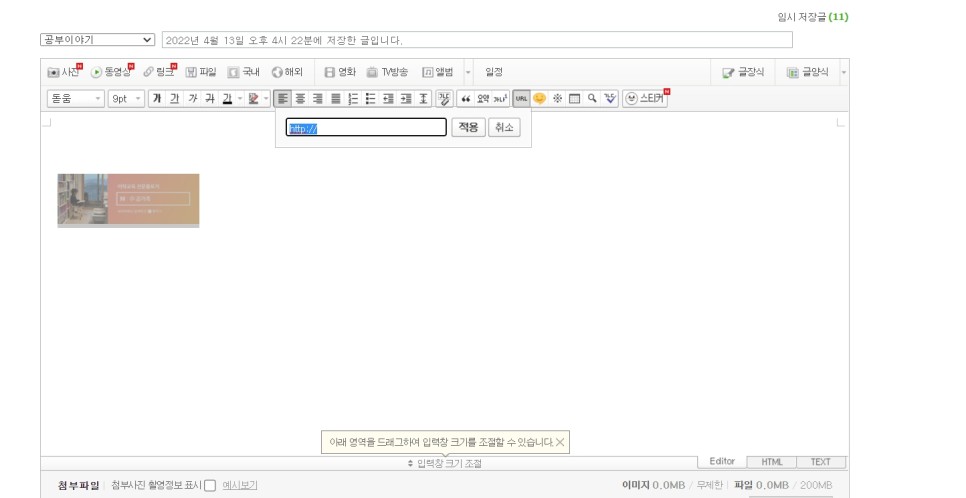 미리 배너 짤을 편집해 놓으셔도 되지만 글쓰기 모드로 짤 편집을 하셔도 됩니다.일단 사진을 읽고 편집을 통해서 사이즈는 가로는 무조건 170픽셀, 세로는 최대 600픽셀까지 다양하게 원하는 대로 설정할 수 있습니다.