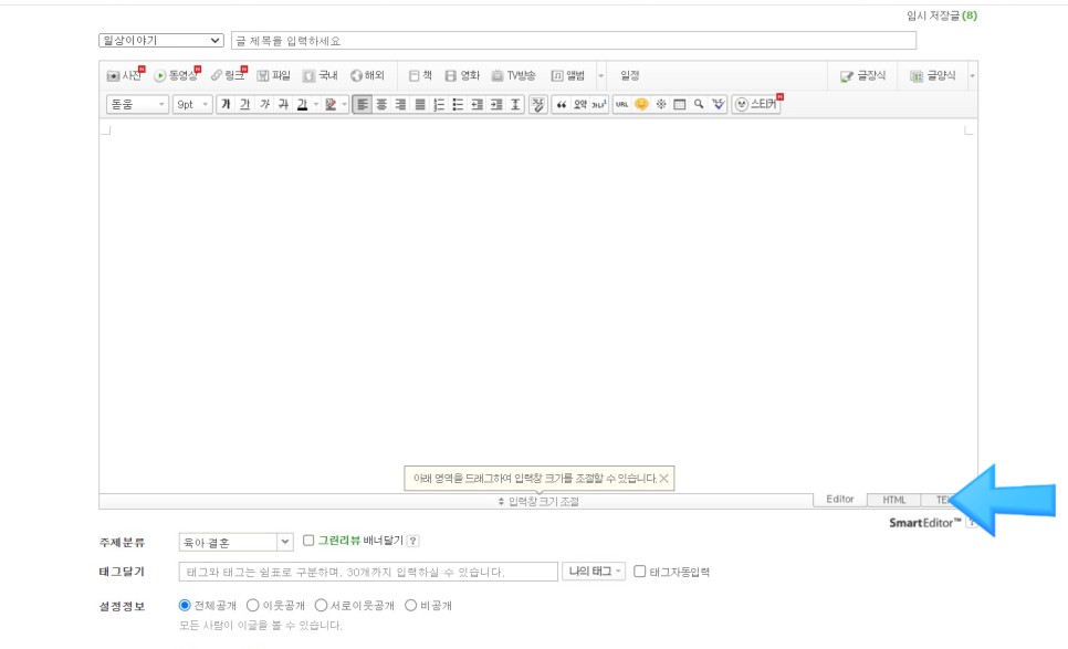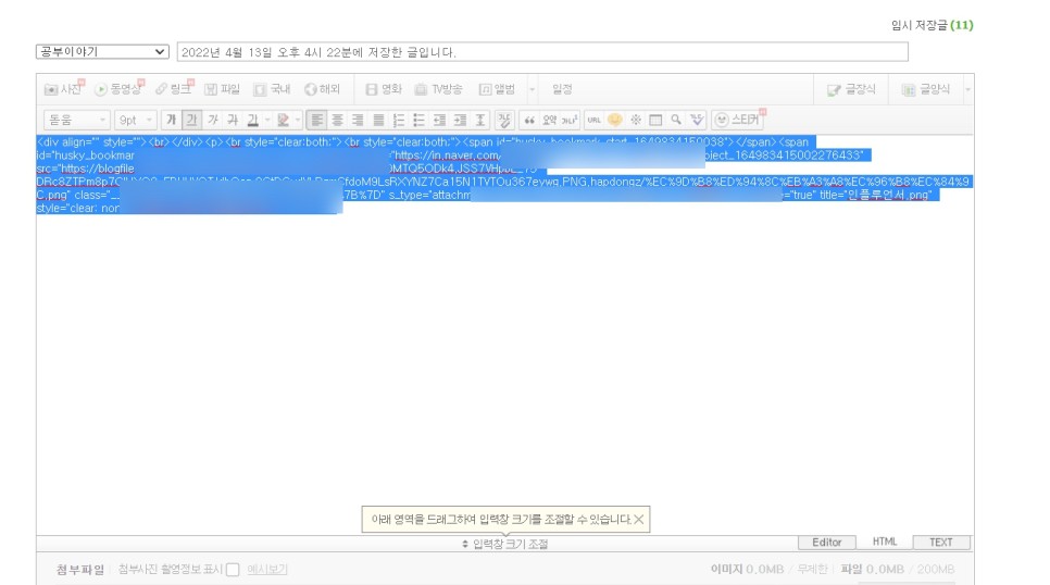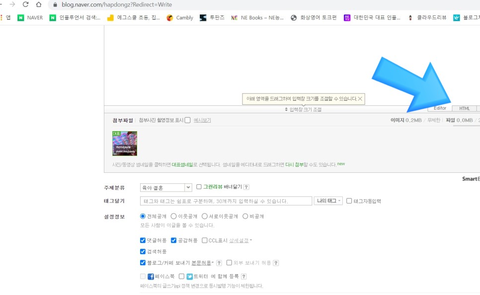 스마트 에디터 2.0에서는 글쓰기 영역 아래에 Editor 영역과 html 영역이 생깁니다.에디터 영역에서 사진을 읽고 쓰고 싶은 링크 주소를 씁니다.