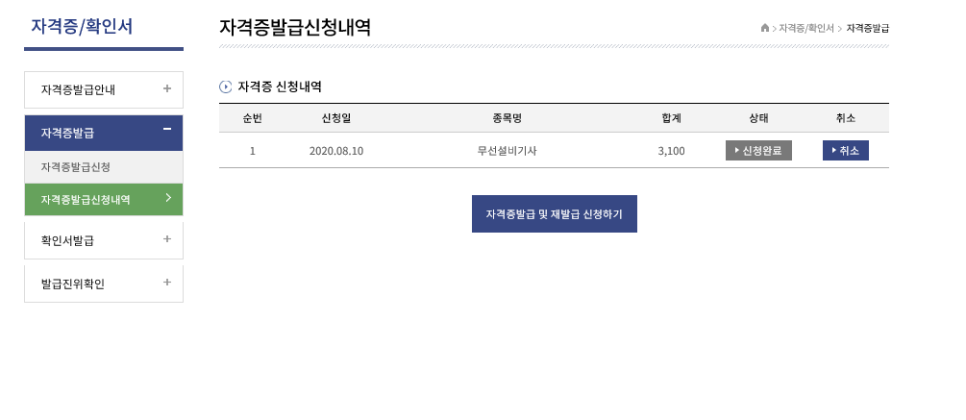 7. [자격증/확인서]- [자격증 발급 신청내역]에서 상태가 ‘신청완료’로 되어 있으면 정상적으로 자격증 발급 신청이 완료되었습니다.