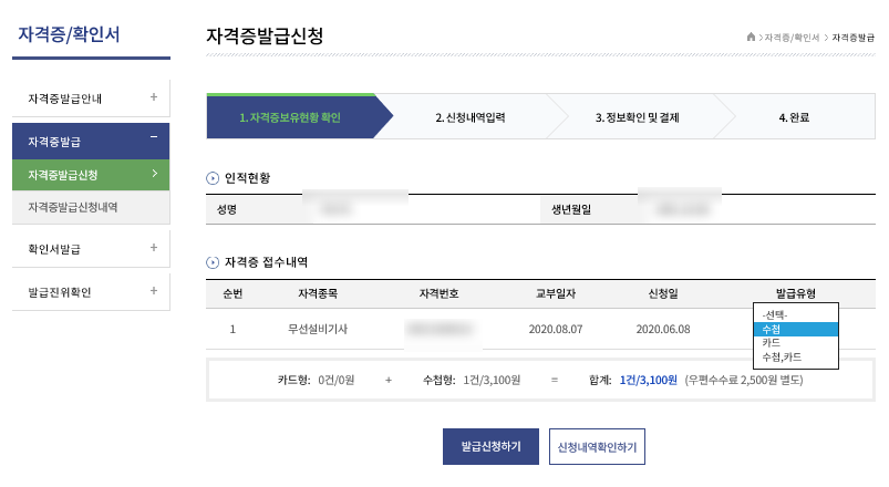 3. ‘자격증 보유 현황 확인’ 단계로 넘어가는데, 여기서 자격증 발급 유형을 선택하셔야 합니다.