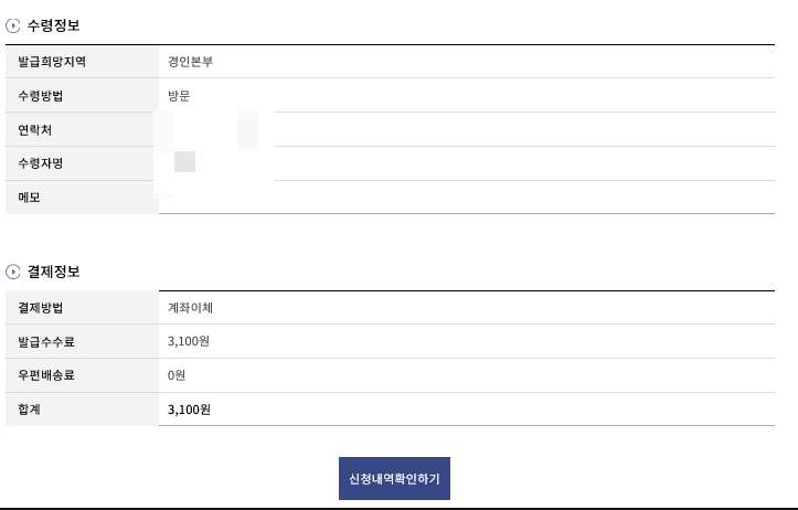 5.’정보확인 및 결제’단계로 넘어가되, 발급사유는 ‘신규’로 하고 방문수령/우편 중 원하는 방법을 선택해주세요.