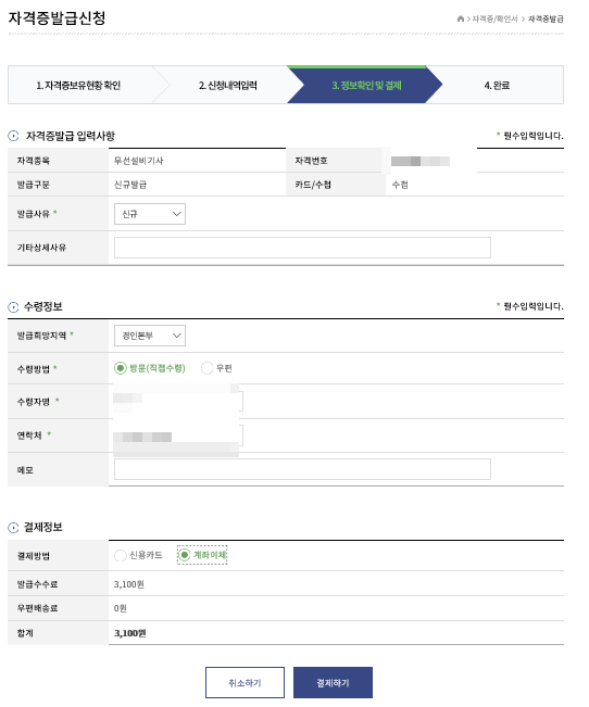 자격 번호는 자격증 발급 후에 부여된다고 합니다.저는 수첩형으로 방문 수령을 선택했습니다.