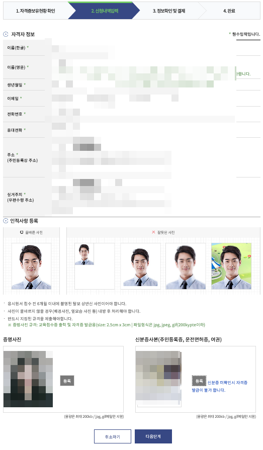 여기서 첨부하는 증명사진이 자격증으로 출력되기 때문에 아무 사진도 넣지 않고ㅠㅠ신분증 사본까지 등록해야 자격증을 발급받을 수 있습니다.