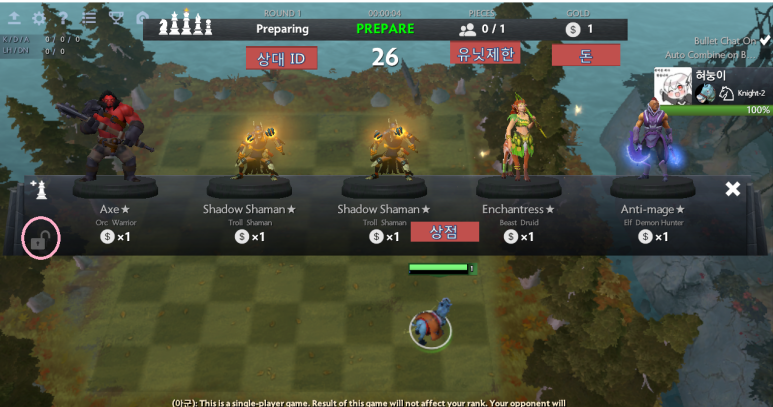 귀하는 각 라운드마다 유닛 구매 및 배치를 통해 전투를 준비하는데, 유닛을 클릭하여 Q에 위치 지정, W에서 창고 복귀 E로 판매할 수 있고 D점 리셋과 F 경험치를 구입할 수 있다.전투준비시간이 끝나면 상대방과의 자동전투가 시작됩니다.* 상점은 매 라운드 시작 시 리셋(비용 2골드)이 무료이며, 잠금을 통해 자동 리셋을 막을 수 있다.