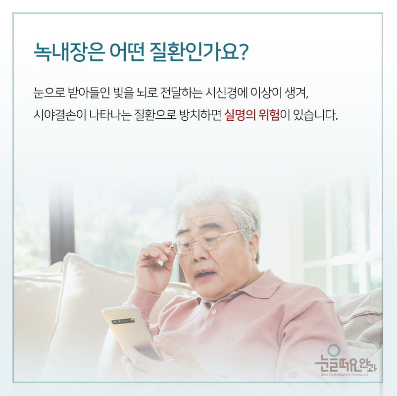 이와 같이 해당 질환은 병의 진행속도가 느리기 때문에 다른 질환보다 비교적 심각성이나 위험성이 두드러지지 않는 것처럼 보이지만, 따라서 평소 정기적인 의료기관을 방문하여 검사를 받으시고 초기에 발견하여 안약이나 레이저, 수술 등의 치료로 높아진 안압수치를 낮춰야 실명에 이르지 않을 수 있습니다.
