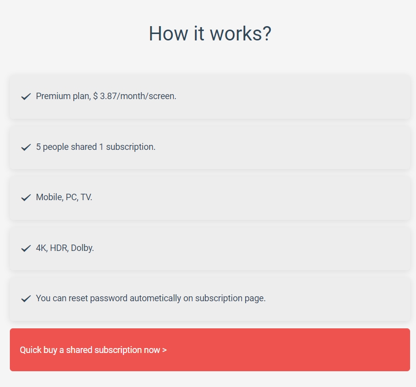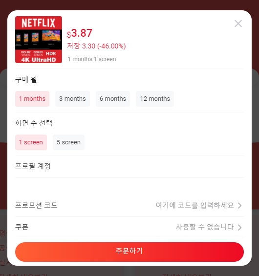 GamsGo에서는 넷플릭스 프리미엄을 月ᅥ G G で정도로 볼 수 있으며, 1년 장기로 끊으면 月 G G G G 정도로 볼 수 있습니다.(결제는 달러로 하기 때문에 환율에 따라 차이가 있을 수 있다.) 또한 프로필로서 스마트폰/PC/TV 3개를 이용할 수 있습니다.