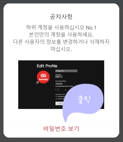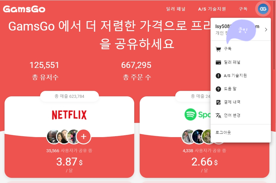 결제 후 다시 GamsGo 사이트로 가서 프로필 표시의 [구독]을 클릭하면 계정 정보(넷플릭스 ID/패스워드)를 확인할 수 있습니다.