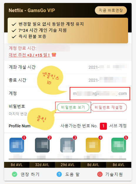 계정 개설일로부터 종료 날짜를 확인할 수 있으며, 계정의 이메일 주소가 넷플릭스 아이디입니다.비밀번호는 [비밀번호 보기]를 클릭하면 보이게 되어 있었습니다.
