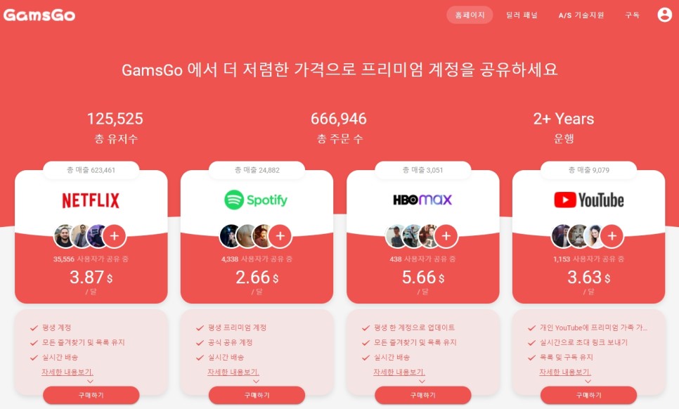 GamsGo라는 사이트는 글로벌 계정 공유 서비스를 제공하는 독일의 플랫폼으로 한국뿐만 아니라 북유럽, 터키, 아르헨티나 등에서도 각광을 받고 있다고 합니다. 뭐.돈을 아끼려는 사람이 한국에만 있을까요? 즉, 위에서 말한 것과 같이 사람들을 모아 돈을 공유하여 내는 방법을 공식적인 계정 공유 플랫폼에서 할 수 있다는 것을 의미합니다.그리고 그 중 가장 유명한 플랫폼이 바로 Gams Go 사이트입니다.