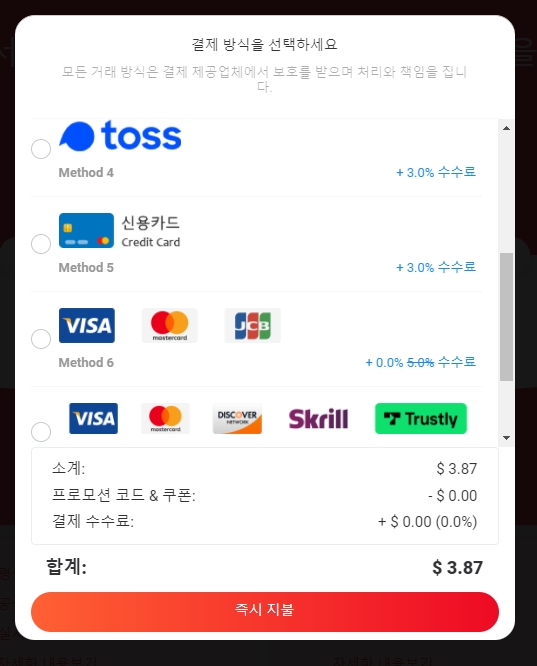 결제창의 모습입니다.현금카드부터 카카오페이, 계좌이체, 토스까지 다양한 방법으로 결제할 수 있어서 너무 좋아요.