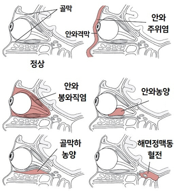 안와내 합병증의 유형 합병증의 진행 과정과 염증의 파급 정도에 따라 안와 주위염, 안와 봉와직염, 골막하 농양, 악와 농양, 해면 정맥동 혈전, 안와첨 증후군으로 구분합니다.