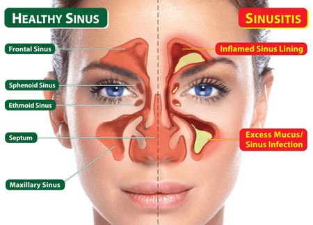 정상(왼쪽), 축농증(오른쪽) 부비강염은 코감기의 연장선으로 보입니다.코감기나 알레르기성 비염이 만성화되면 세균이 부비강 내에서 증식하고 화농성 방출물을 생성하여 빈 공간에 농도가 축적됩니다.그래서 축농증이라고 부릅니다.