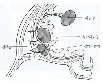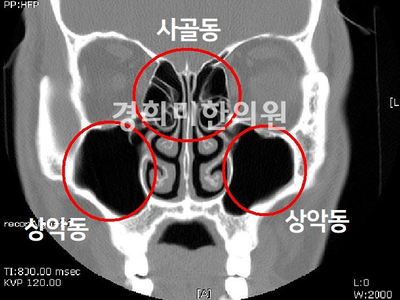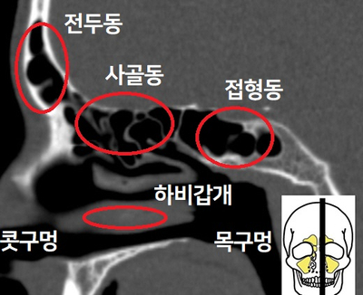 전두동, 사골동, 접형동양미간과 이마 아랫부분에 전두동이, 그리고 전두동 깊숙이 차례로 사골동, 접형동이 자리잡고 있습니다.두개내 합병증의 원인 병소는 전두동, 사골동, 접형동의 순입니다.
