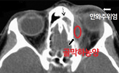 골막하농양의 CT 영상골막하농양은 안와를 둘러싸고 있는 골막과 부비동 골벽 사이의 농양으로 골막하농양이 안와내측에 농양을 형성하면 안와농양이 됩니다.증상은 안와직염과 유사하며 안근, 시신경 손상이 크고 시력 소실을 유발할 수 있습니다.