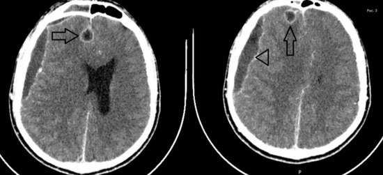 경막하농양(삼각)과 뇌농양(화살표시) MRI 영상경막하농양의 위치는 전두엽 부위에 많은데 대뇌표면을 따라 전파되거나 산발적인 농양이 형성됩니다.초기에는 수막염 증상을 보였으나 급속히 악화되어 의식 저하, 편마비, 발작을 볼 수 있습니다.뇌농양의 경우 크기가 커지면 뇌압의 상승과 함께 대뇌 탈출, 농양 파열로 사망에 이를 수 있습니다.