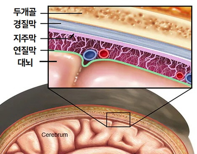 뇌수막의 구조 뇌수막 구조는 위 그림과 같이 경질막, 지주막, 연수막의 3층으로 이루어져 있습니다.두개내 합병증의 가장 일반적인 유형인 뇌수막염에서는 두통, 발열, 목강직, 흥분, 기면증의 증상을 보이며 CT나 MRI 검사, 소변 추천자(뇌척수액 검사)가 필요합니다.
