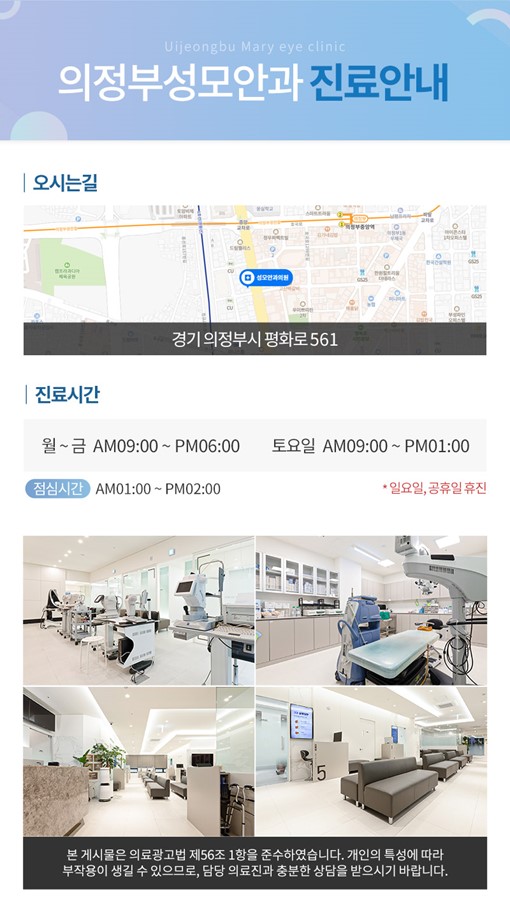 의정부 성모안과는 의정부에서 20년 넘게 운영해 왔으며 대표원장 김준영 원장, 양지욱 원장, 한재현 원장 3명 모두 대학병원에서 7년~10년간 근무한 경력이 있는 교수 출신 안과 전문의입니다. 그만큼 풍부한 임상경험이 있으니 믿고 방문하세요.