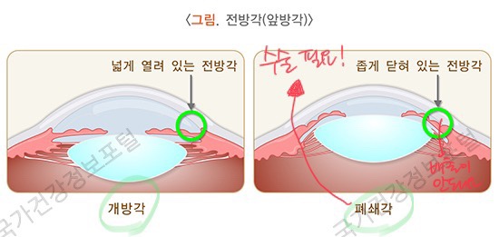 눈 속을 채우고 있는 액체(방수)는 일정량이 생기고 일정량 배출되는 순환 과정을 거칩니다.전방각이라고 불리는 각막의 뒷면~홍채의 뿌리 앞 주변에 이르는 부분에 방수가 배출되는 통로가 있는데, 이곳이 막히지 않은 녹내장을 개방각 녹내장, 이곳이 닫힌 녹내장을 폐쇄각 녹내장이라고 합니다.