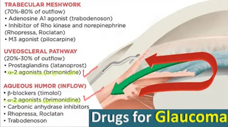 작용 원리 브리모니딘은 눈에 있는 교감 신경 전달 물질 수용체인 α2 수용체에 선택적으로 작용하는 효능제입니다 브리모니딘의 작용으로 교감 신경 전달 물질인 노르에피네프린의 방출이 억제되어 섬모체 상피 세포에서 방수 (눈 속의 액체)의 생성을 억제합니다.