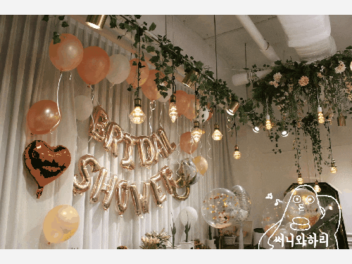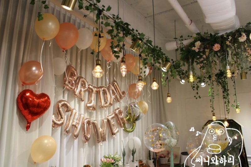 제일 메인 포토존이 2개예요. 특히 저 브라이덜 샤워풍선 달린 곳은 사진이 정말 잘 나와요! 불 끄고 찍으면 또 다른 분위기 연출할 수 있거든요 ㅎㅎㅎ