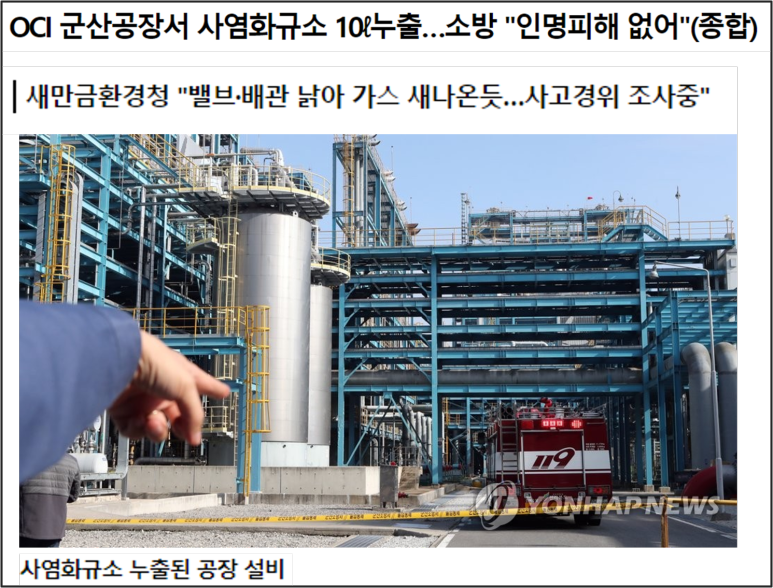 2018년 11월 전북 군산시 산북동 OCI 군산공장에서 유독물질인 사염화규소 약 10ℓ가 누출되는 사고가 있었습니다 공장에서는 이상을 감지하여 추정되는 배관을 닫아 추가 누출을 막아 인명 피해는 없었습니다.