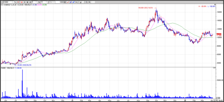 이런 분위기를 반영하듯 OCI 주가는 상승 흐름을 탔고 한때 주가가 전날보다 12% 급등해 변동성완화조치(VI)가 발동되기도 했습니다기업정보