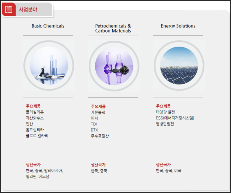 “존속법인은 옛 제철화학으로 2008년 폴리카본 실리콘 상업생산에 성공하고, 2009년 이니셜 “OCI”를 사명으로 사용했으며, 2010년 단열재 사업도 시작합니다” 2021년에는 태양광 발전의 기초소재인 폴리실리콘가격이 상승하면서 흑자전환하여 6000억원 정도의 영업이익을 올렸고, 올해는 부광약품 인수로 최대주주가 되었습니다.