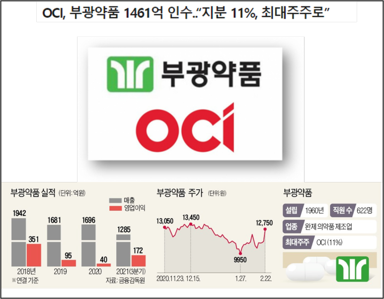 부광약품은 2월 22일 최대주주 및 특수관계인이 보유하고 있던 지분 11%를 OCI에 매각한다고 발표했습니다 거래금액은 각자 최대주주가 된 셈이죠.