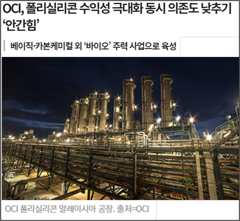 OCI는 중국 업체들의 저가공세로 폴리실리콘 가격이 침체돼 있던 2020년 초 원가 절감을 고려해 국내 군산공장 생산을 철수했습니다 그럼에도 불구하고 말레이시아의 생산거점은 남아 있지만 현재 폴리실리콘 [수요우위] 현상으로 인해 당시 OCI의 결정이 [신의 한 수]로 평가되고 있습니다.사염화 규소 누출 사고
