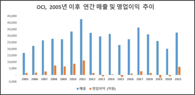 OCI의 2021년 매출액은 일시적으로 2020년 대비 62% 증가하고, 영업이익은 유일하게 흑자 전환되었습니다. 2019년도에, 2020년 단기 등 영업손익이 손해를 기록하고 있는데, 3년 만에 흑자 전환과 함께 2011년 이후 10년 만에 최대 이익을 달성하는 성과를 냈습니다.