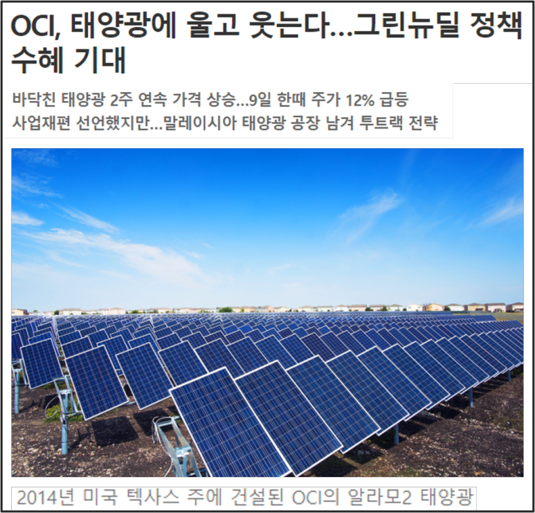 OCI는 태양광 관련주로 분류돼 정부 정책에 상당히 민감한 모습을 보이고 있습니다 2020년에는 각국 정부가 코로나19 경제 침체 회복 수단으로 그린뉴딜 정책을 펼쳤을 때 수혜 업종으로 태양광이 포함되면서 말레이시아에 남겨둔 태양광 폴리실리콘사업에 대한 기대감이 높아졌습니다.