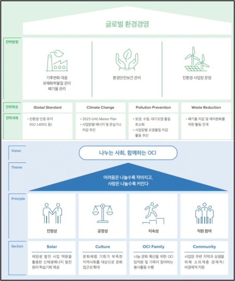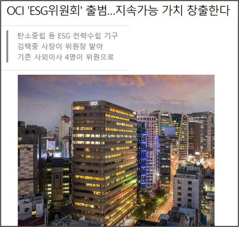 “지난해 6월 OCI는 이사회 산하에 ‘ESG위원회’를 발족, 환경·책임·투명경영(ESG) 경영을 본격화했습니다” OCI는 ESG 전략 및 주요 사항을 수립, 검토, 분석하여 장기적으로 지속 가능한 가치 창출을 위해 ESG 위원회를 신설한다고 발표했습니다.