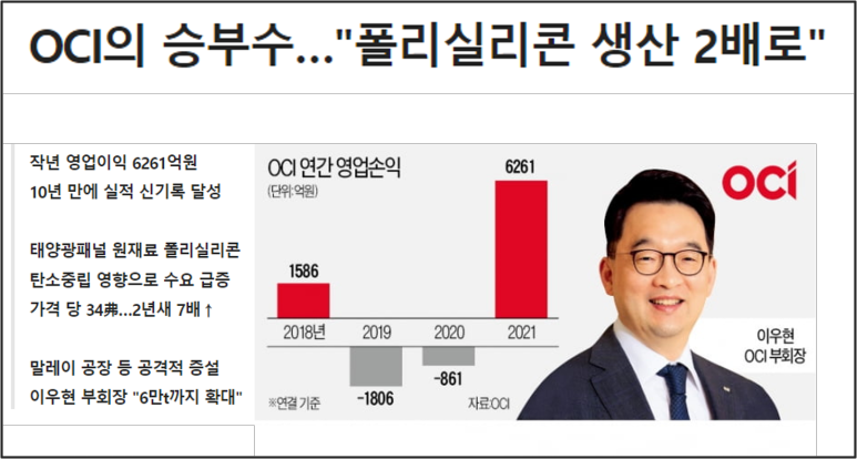 OCI는 탄소 중립 시대를 맞아 글로벌 태양광 발전 수요가 폭발하면서 기초 소재인 폴리실리콘 가격이 급등했기 때문입니다 OCI는 왕년의 스타 기업으로서의 명성을 되찾기 위해 폴리실리콘 생산량을 올해 현재 대비 두 배 이상 확대한다는 계획을 세웠습니다
