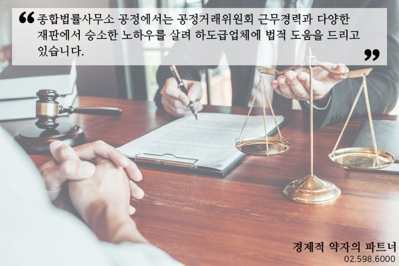 하도급법 제11조 [감액 금지]① 원사업자는 제조 등을 위탁할 때 정한 하도급대금을 감액해서는 안 된다. 단, 모(母)사업자가 정당한 이유를 입증한 경우에는 하도급대금을 감액할 수 있다②다음 각 호의 어느 하나에 해당하는 모(母)사업자의 행위는 정당한 이유에 의한 행위로 간주하지 않는다. 1. 위탁할 때 하도급대금을 감액하는 조건 등을 명시하지 않고 위탁 후 협조 요청 또는 거래 상대방으로부터의 발주 취소, 경제상황 변동 등 불합리한 이유를 들어 하도급대금을 감액하는 행위 2. 수급사업자와 단가 인하에 관한 합의가 성립된 경우에는 그 합의 성립 전에 위탁한 부분에 대해서도 합의 내용을 소급하여 적용하는 방법으로 하도급대금을 감액하는 행위 3. 하도급대금을 현금으로 지급하거나 지불 기일 전에 지불하는 것을 이유로 하도급대금을 과도하게 감액하는 행위 4. 원사업자에게 실질적 영향을 미치지 않는 하도급대금의 과수리·오수리하는 행위.하나의 물품 등을 자신으로부터 사게 하거나 자신의 장비 등을 사용하게 한 경우에 적정한 구매대금 또는 적정한 사용대가 이상의 금액을 하도급대금에서 공제하는 행위 6. 하도급대금 지불시점의 물가 또는 자재가격 등이 납품 등의 시점에 비해 떨어졌음을 이유로 하도급대금을 감액하는 행위 7. 경영적자 또는 판매가격의 인하 등 불합리한 이유로 부당하게 하도급대금을 감액하는 행위 8. 고용보험 및 산재보상보험의 보험료 징수 등에 관한 법률, 「산업안전보건법」 등에 따라 원사업자가 부담해야 하는 고용보험료, 산업안전보건사업비, 그 밖의 행위령조사 결과 Q사가 공사 내역 일부를 누락하고 하도급 대금을 확정하도록 강요한 사실이 드러났습니다. 이러한 행위는 하청법에서 금지하고 있는 부당한 하도급대금의 감액으로 간주되어 하도급대금을 감액할 수 있는 정당한 이유로 인정되지 않을 가능성이 높습니다.따라서 Q사는 미반영 항목을 포함해 하도급대금을 재산정, 지급해야 한다고 볼 수 있습니다. 법무법인 공정거래위원회 출신 1호 변호사 황보윤 대표변호사와 정재찬 전 공정거래위원장 상임고문은 오랜 실무 경험과 노하우를 바탕으로 불공정거래 소송을 진행합니다.조사 결과 Q사가 공사 내역 일부를 누락하고 하도급 대금을 확정하도록 강요한 사실이 드러났습니다. 이러한 행위는 하청법에서 금지하고 있는 부당한 하도급대금의 감액으로 간주되어 하도급대금을 감액할 수 있는 정당한 이유로 인정되지 않을 가능성이 높습니다.따라서 Q사는 미반영 항목을 포함해 하도급대금을 재산정, 지급해야 한다고 볼 수 있습니다. 법무법인 공정거래위원회 출신 1호 변호사 황보윤 대표변호사와 정재찬 전 공정거래위원장 상임고문은 오랜 실무 경험과 노하우를 바탕으로 불공정거래 소송을 진행합니다.위 사례는 분쟁으로 해결되었습니다. 그러나 분쟁에서도 협의점에 도달하지 못하는 경우가 한두 번이 아니어서 분쟁은 어디까지나 분쟁을 조정할 뿐 하청업체의 손해를 모두 보상하는 것은 아닙니다.따라서 필요한 것이 하청 변호사를 통한 불공정 거래 소송입니다. 법무법인 공정은 오랜 노하우와 경험을 바탕으로 상황에 맞는 법률 컨설팅을 진행하고 있습니다. 수급업자 혼자만의 힘으로는 처리하기 어려운 문제, 법적 대리인이자 파트너가 되는 법무법인 공정과 함께 하기를 바랍니다.위 사례는 분쟁으로 해결되었습니다. 그러나 분쟁에서도 협의점에 도달하지 못하는 경우가 한두 번이 아니어서 분쟁은 어디까지나 분쟁을 조정할 뿐 하청업체의 손해를 모두 보상하는 것은 아닙니다.따라서 필요한 것이 하청 변호사를 통한 불공정 거래 소송입니다. 법무법인 공정은 오랜 노하우와 경험을 바탕으로 상황에 맞는 법률 컨설팅을 진행하고 있습니다. 수급업자 혼자만의 힘으로는 처리하기 어려운 문제, 법적 대리인이자 파트너가 되는 법무법인 공정과 함께 하기를 바랍니다.법무법인 공정서울특별시 서초구 서초대로50길 8 관정빌딩법무법인 공정서울특별시 서초구 서초대로50길 8 관정빌딩법무법인 공정서울특별시 서초구 서초대로50길 8 관정빌딩법무법인 공정서울특별시 서초구 서초대로50길 8 관정빌딩