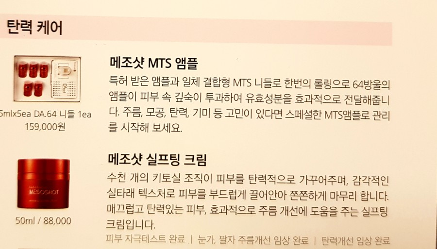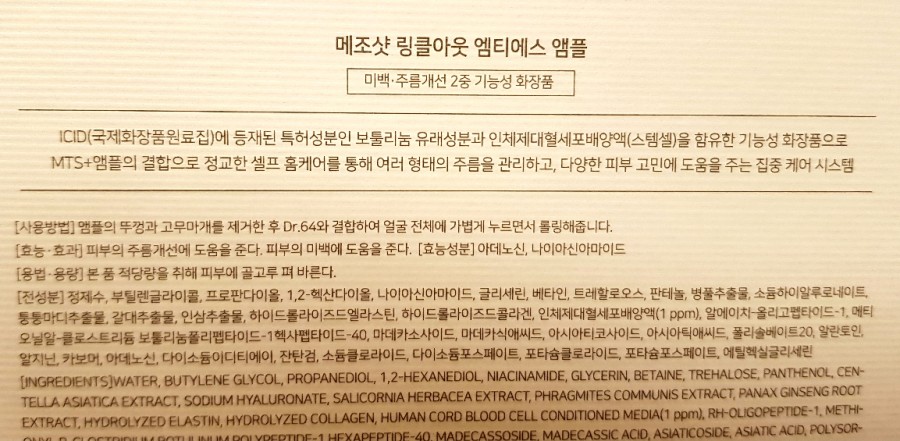 ICID(국제화장품원료집)에 등록된 특허성분인 보툴리누스 유래성분과 인체성 대혈세포 배양액(스템셀)이 함유된 기능성 화장품으로 MTS+앰플의 결합으로 정교한 셀프 홈케어를 통해 다양한 형태의 주름을 케어해주고 다양한 피부 고민에 도움을 주는 집중 케어 시스템