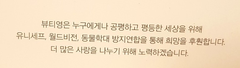 뷰티연은 누구에게나 공평하고 평등한 세상을 위해 유니세프, 월드비전, 동물학대방지연합을 통해 희망을 후원합니다더 많은 사랑을 나누기 위해 노력하겠습니다