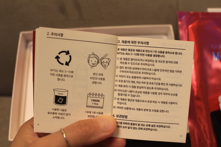 MTS는 최소 5~10회 미만의 사용을 원칙으로 합니다.본인 이외의 사람의 사용은 금합니다.사용한 니들은 알코올에 10분간 적셔 소독합니다.일주일에 한번씩 사용하시길 권합니다.