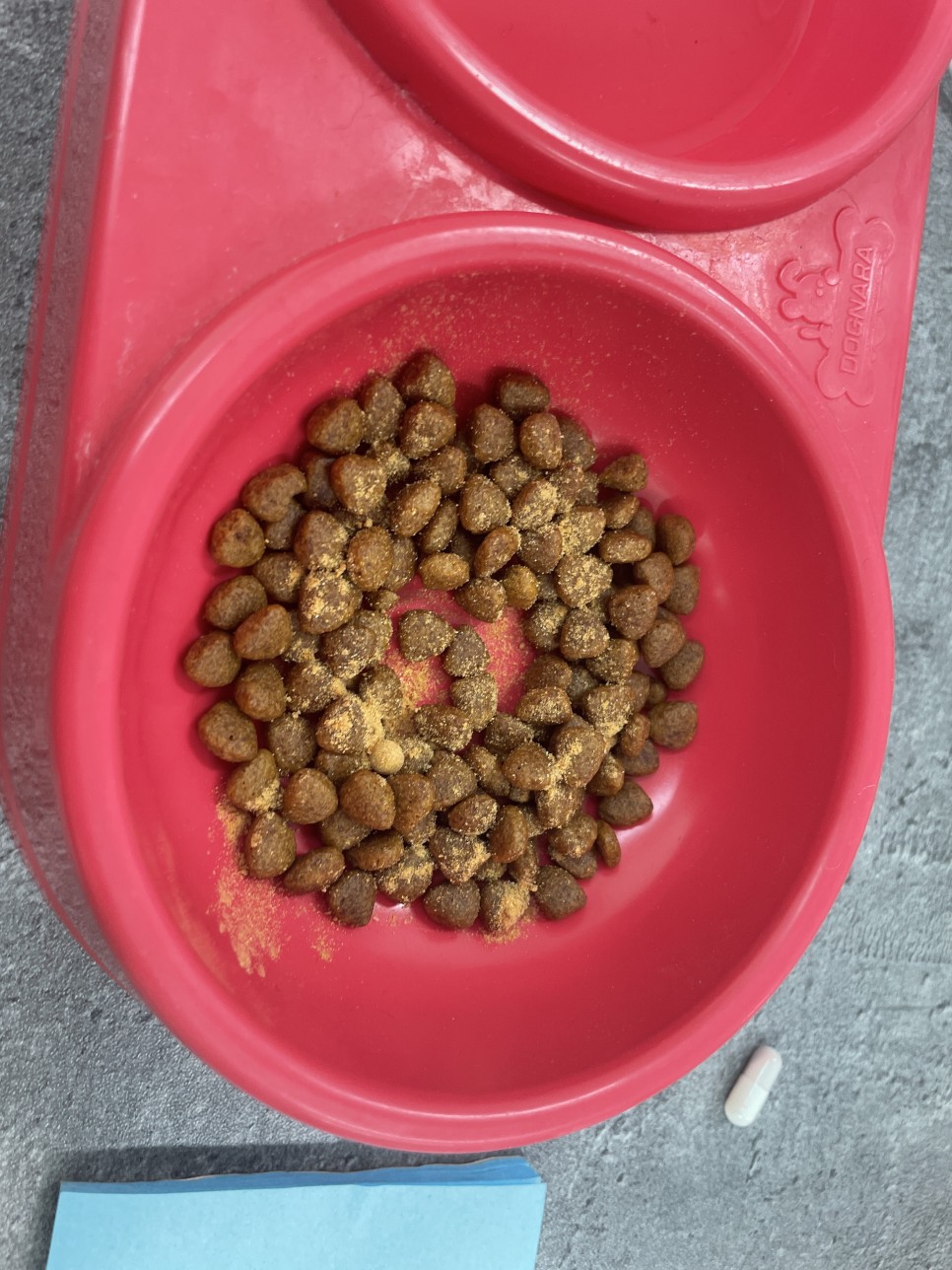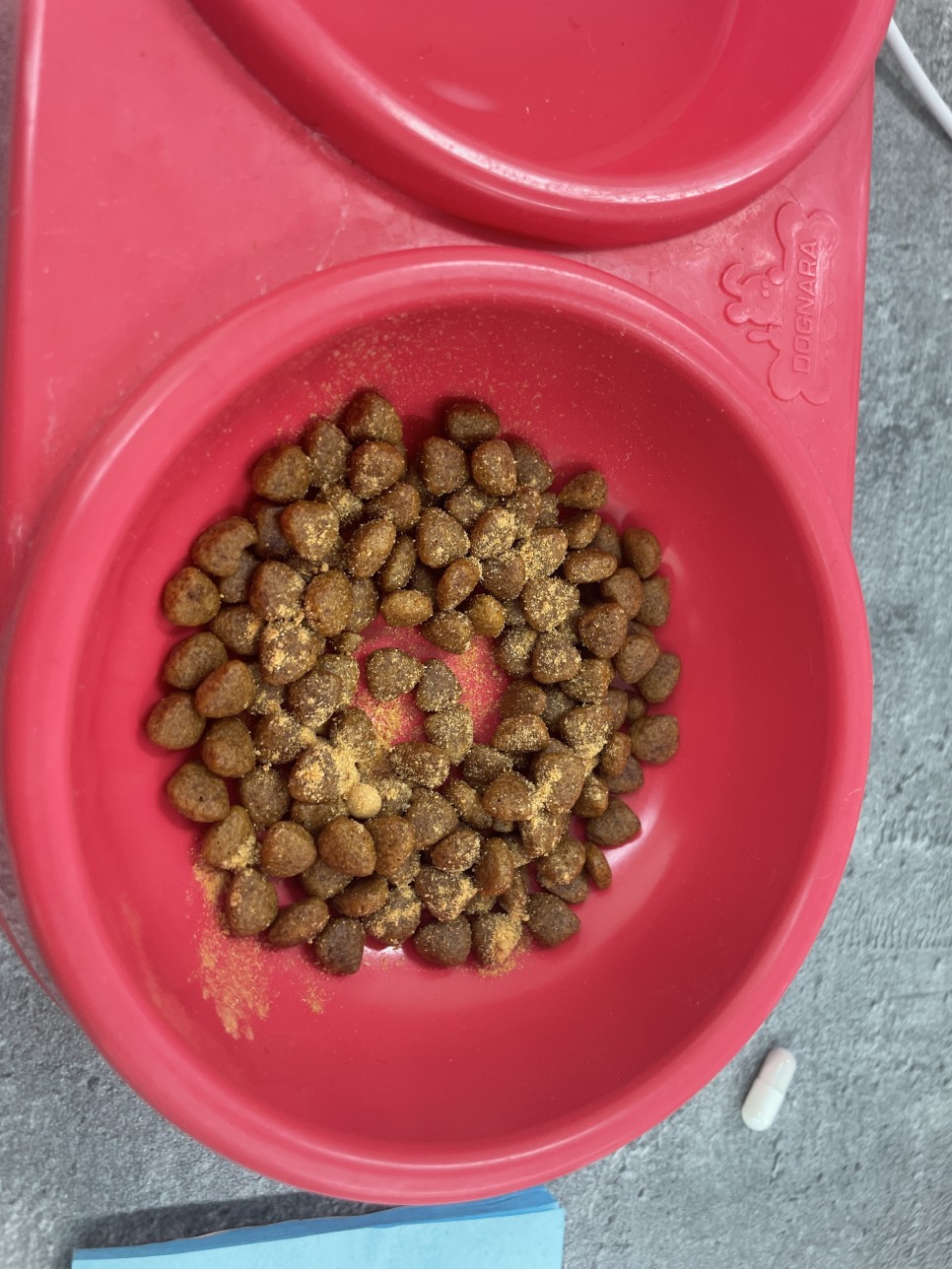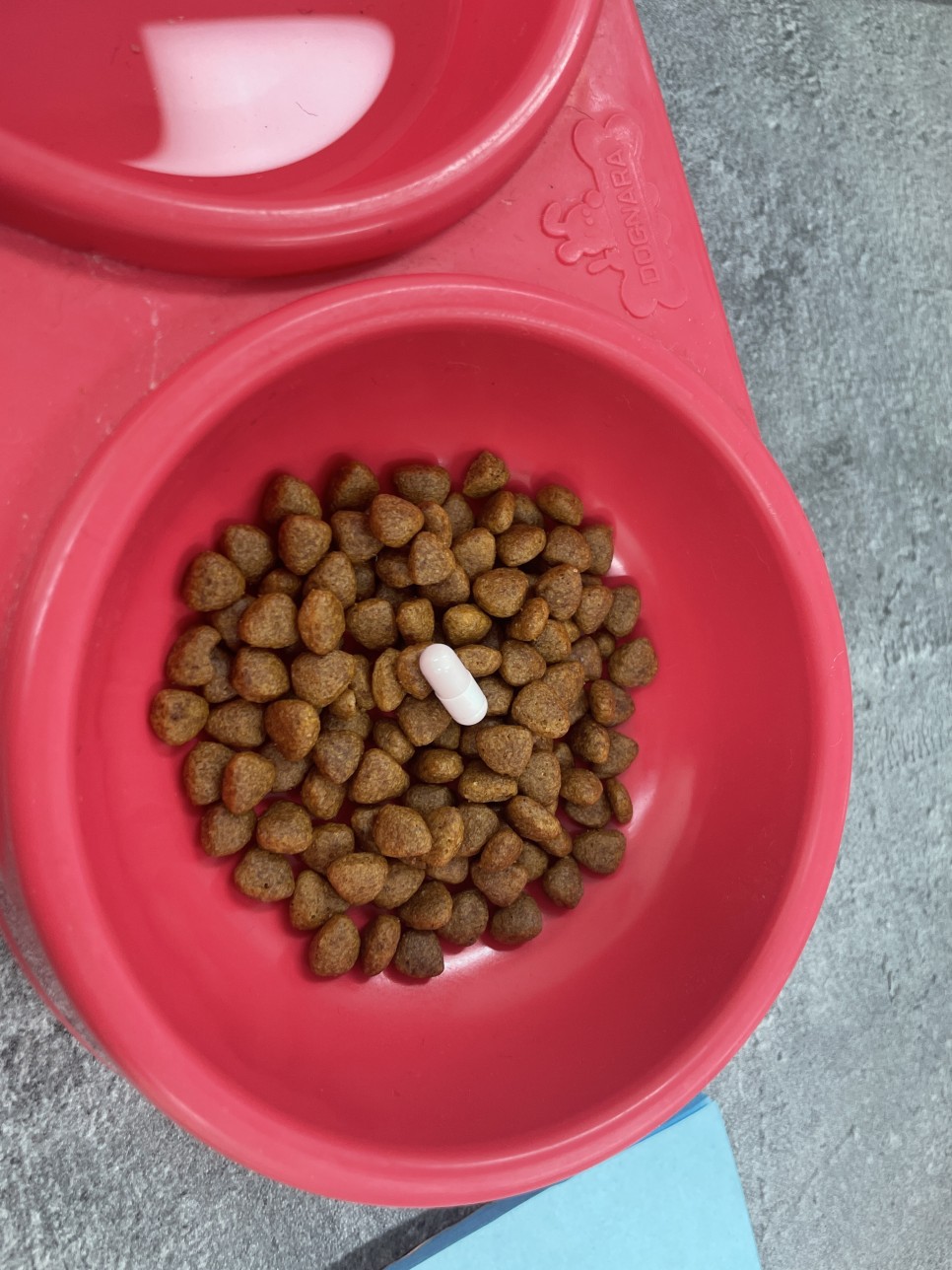저는 알약 그대로 주기도 하고 가끔은 밥에 섞어 주기도 했습니다.간식 사이에 살짝 끼어도 정말 잘 먹거든요