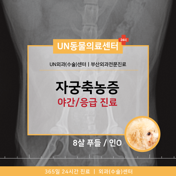 저희 O는 새벽부터 생식기 쪽에서 피가 흘러 저희 병원에 응급진료를 받게 되었습니다.문진에서 일주일 전부터 식욕이 점점 떨어지는 것을 알 수 있었지만 신체검사 시 복부가 퉁퉁 붓고 생식기 주변에서 점액성 물질과 함께 피가 확인되었습니다.개의 정상 자궁은 매우 가는 실 같지만 자궁에 고름이 쌓이면 부풀어 오르고 생식기 외부에 고름이 나오거나 체내의 염증으로 식욕 부진, 다음 다뇨, 구토, 탈수 등의 다양한 임상 증상이 나타날 수 있습니다.