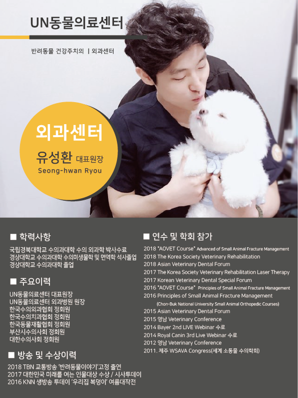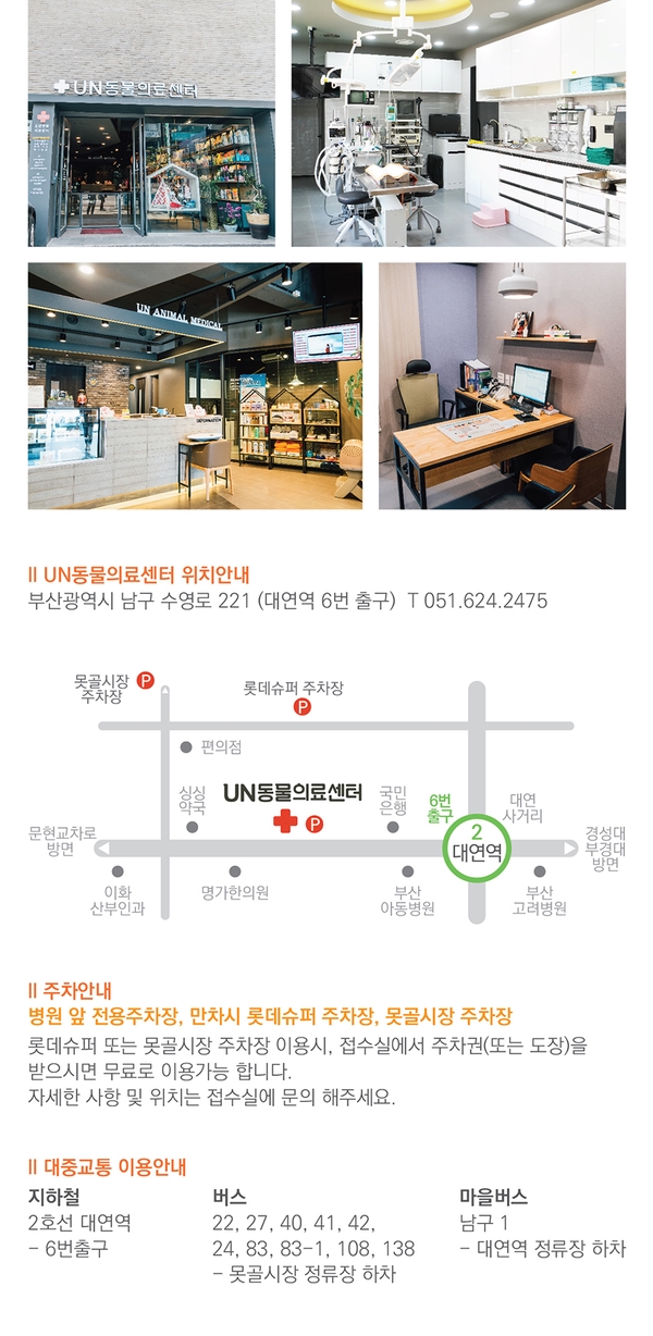 안녕하세요! 남구 대연동에 위치한 부산 24시 동물병원 UN동물의료센터입니다.유엔 동물의료센터는 함께 살아가는 반려견의 ‘동행’을 위해 최선을 다하겠습니다.