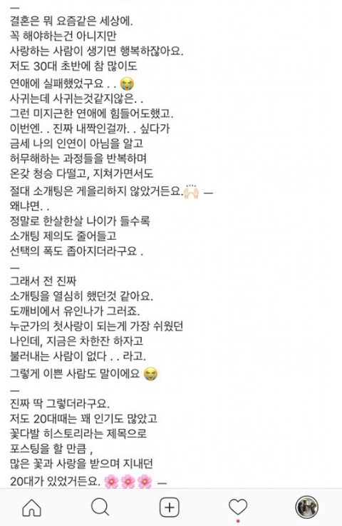 #10대연애 #20대연애 #30대연애 #설레는연애 #연애경험담 *반말진행입니다.오늘은 투덜거릴 것 같네.나는 고등학교 2학년 때 처음 연애를 했어.본능에 이끌려서 연애하다 보니까 진짜 아무것도 모르잖아.모든 게 처음이었지.첫 키스는 아직 기억나네. 시장… 문 닫은 시장에서 엄청 뽀뽀했어마치 둘 다 뭔가에 홀린 사람처럼 ww 10대 때는 두 번 연애했어.남아서 여학생들을 만날 기회는 별로 없었지만 친구들과 인연으로 친구들을 사귀었어.지금 생각하면 정말 풋풋했다.100% 순수하게 좋아하는 마음으로 서로 끌리는 마음으로 만났으니 데이트도 떡볶이집 ㅋㅋㅋ 버스타고 투어데이트 ㅋㅋ 좋았겠다. 20대 들어서 연애를 많이 했어.19살부터 카페에서 아르바이트를 했어.진짜 쌈이 많았어.손님이랑도 많았고 알바도 많았고 또 이렇게 쓰면 오해할까봐 그러는데 나는 너무 평범해.10대 연애와 20대 연애는 전혀 달랐어.연애가 10대는 새내기였다면 20대는 농염했다.20대는 정말… 대단했지진짜 눈 마주치면 불타오르니까 어쩌면 그런 연애는 20대 초반에만 할 수 있을 것 같아.군대 갔다와서 20대 중반쯤 되면 사람 만나는 것도 조심스럽고 제대하자마자 여자친구가 생겼어.미대 다니면서 캠퍼스 라이프 즐겼지?과에는 거의 여성이지. 남자는 3명뿐이야. 왜 여자친구가 생기지 않는지 그냥 가만히 있어도 할 수 있었다.그런데 문제는 직장 다니면서부터다, 솔직히 20대 중반까지 딱 거기까지가 정말 서로 재력을 보지 않고 하는 연애의 끝인 것 같다.20대 후반이 되자 남녀가 슬슬 조건을 따지기 시작한다.회사 다니면서 차를 끌고 가야 연애가 가능한 게 20대 후반이고 사실 20대 후반이 힘들다고 생각하는 사람은 30대에 들어서는 순간 20대 연애가 무섭게 그리워질 것이다.내가 그랬어 ㅋㅋ 딱 29.9까지 연애하다가 서른이 되니까 소개팅을 하든 어떻게 만나든 조건을 무섭게 보더라구. 하지만 20대 후반에는 서로 마음에 들면 집까지는 묻지 않았어.직장도 물론이고.근데 30대 되면 집안도 따진다 ㅋㅋㅋ 소개팅 한번만 해봤는데 너무 안좋은 기억만 남아서 그다음엔 소개팅 절대 안해.사람과 사람이 만나는 거야. 결혼은 나는 그렇게 생각해.서로 아끼고 키우면서 하나하나 이루고 즐겁게 하는 게 결혼인 것 같아.아예 빚내서 집 빌려서 차 사고… 아… 집이 생겨서 좋으려나?아니, 꼭 아파트 32평에 가야 하는 이유가 있나?시작은 둘이 살기에 투룸이면 충분하잖아.그렇지? 정말… 어려운 세상30대가 되고나서 연애는 안했지만(사실 못할것같아..)글씨만 추가해야 연애할 것 같아.솔직히 예전에 연애했던 게 좀 그리워서 그때 사랑했던 좋아하는 사람이랑 결혼했어야 했나? 이런 생각도 들고 결혼은 딱 20대 후반을 넘지 않는 게 좋을 것 같아.26이나 27 정도가 딱 좋아.서로 콩깍지가 벗겨지지 않을 때.앞으로 나의 30대에 어떤 사람이 나와 인연으로 이어질지 모르겠지만 정말 좋은 사람을 만나고 싶다.나랑 마음 맞는 사람 만나는 게 정말 힘들어.근데 어딘가는 있겠지? 그런 사람..아직 결혼이란 단어는 나한테는 어색하지만 기회가 된다면 꼭 해보고 싶은데 결론이 뭐라고?연애하고 싶다. 10대, 20대처럼 풋풋한 연애, 정말 그 사람만 보고 만나는 연애. 타이머신은 언제 개발되나.
