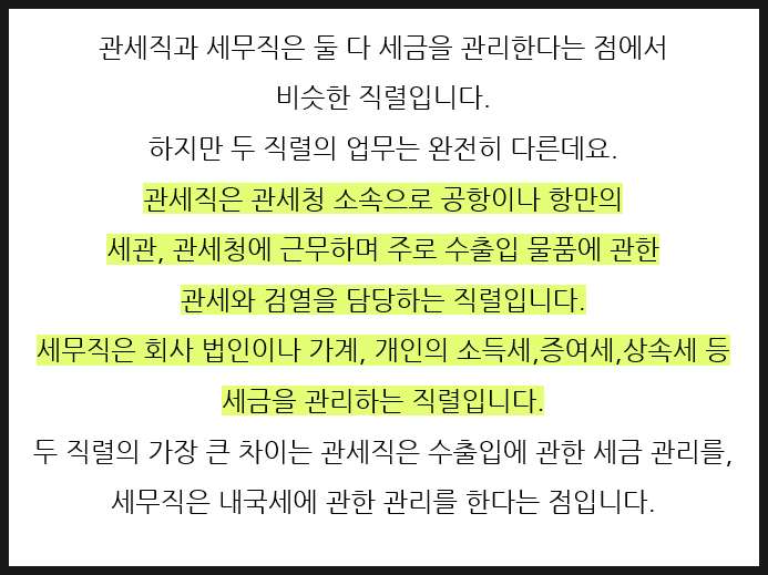 관세직은 국내외를 오가는 모든 물품을 통관하는 기관입니다. 국가재정과 국민경제를 보호하고 사회안전과 민생을 위한 요소 유입을 차단하며 합법적인 국제무역과 여행지 이동을 촉진하는 곳입니다. 세금을 다루는 공직자라는 점에서 세무직과 비슷하게 볼 수도 있지만 사실 세무직과는 많이 다른 일을 하고 있습니다. 관세직 공무원은 관세청 소속이므로 지방직 채용은 이루어지지 않습니다. 오직 국가직 채용시험을 통해서만 인재를 선발하고 있습니다. 따라서 이 직렬을 지원하는 수험생은 1년에 한 번뿐인 응시 기회만 얻을 수 있기 때문에 더욱 부담이 클 수밖에 없습니다. 다만 수출입 등 국제적 교류 규모가 커질수록 필요한 인력도 늘어날 수밖에 없기 때문에 국가 경제 성장에 따라 밝은 채용 전망을 보인다는 장점도 가지고 있습니다. 세무직과 관세직 필기시험 과목