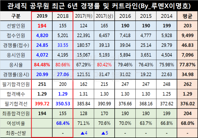 올해 2022 국가직 9급 공채로 세무직은 850명 선발, 관세직은 38명 선발을 계획했습니다. 그리고 이 세무직에 10,956명이 지원해 경쟁률 12.9:1을 기록했고 관세직에 1,996명이 지원해 52.5:1을 기록했습니다. 세무직은 많은 인원을 모집하는 만큼 많은 지원자가 모였습니다.특징으로 보이는 점은 올해 대부분 직렬이 지난해보다 경쟁률이 하락한 반면 관세직은 유일하게 경쟁률이 지난해보다 올랐다는 점입니다. 필기개편 영향으로 관세직을 포함한 대부분 직렬이 지난해에 비해 출원인원이 크게 줄었지만 관세직만 경쟁률이 소폭 오른 이유는 채용규모가 지난해보다 크게 줄었기 때문으로 보입니다. 2021년 관세직 채용 인원은 55명이었습니다. 그러나 올해 38명으로 크게 줄었고, 출원인 감소폭보다 채용규모 감소폭이 컸기 때문에 경쟁률이 소폭 상승했습니다.