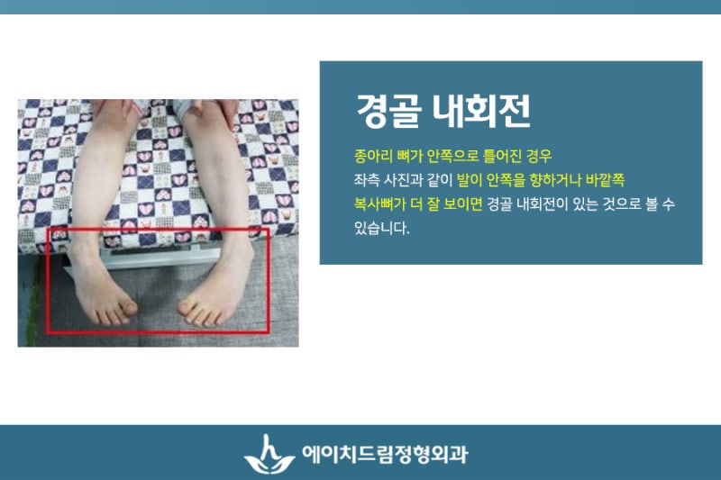 ② 종아리뼈가 안쪽으로 구부러져 있는 경우, 누운 상태에서 무릎이 정면(천장)을 향하고 있는 경우 다리, 종아리는 약간 바깥쪽을 향해야 합니다. 왼쪽 사진처럼 다리가 안쪽을 향하고 있거나 바깥쪽 복사뼈가 잘 보이면 경골 내 회전이 있는 것으로 보입니다.